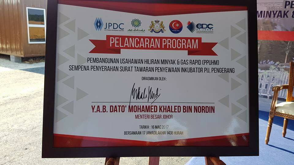 Majlis Penyerahan Surat Tawaran Penyewaan Inkubator PIJ, Pengerang disempurnakan Menteri Besar Johor, Y.A.B. Dato’ Mohamed Khaled Nordin.
